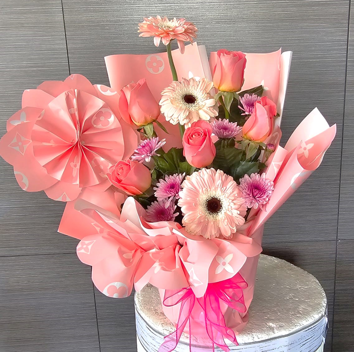 Arreglo floral de rosas con gerberas.
